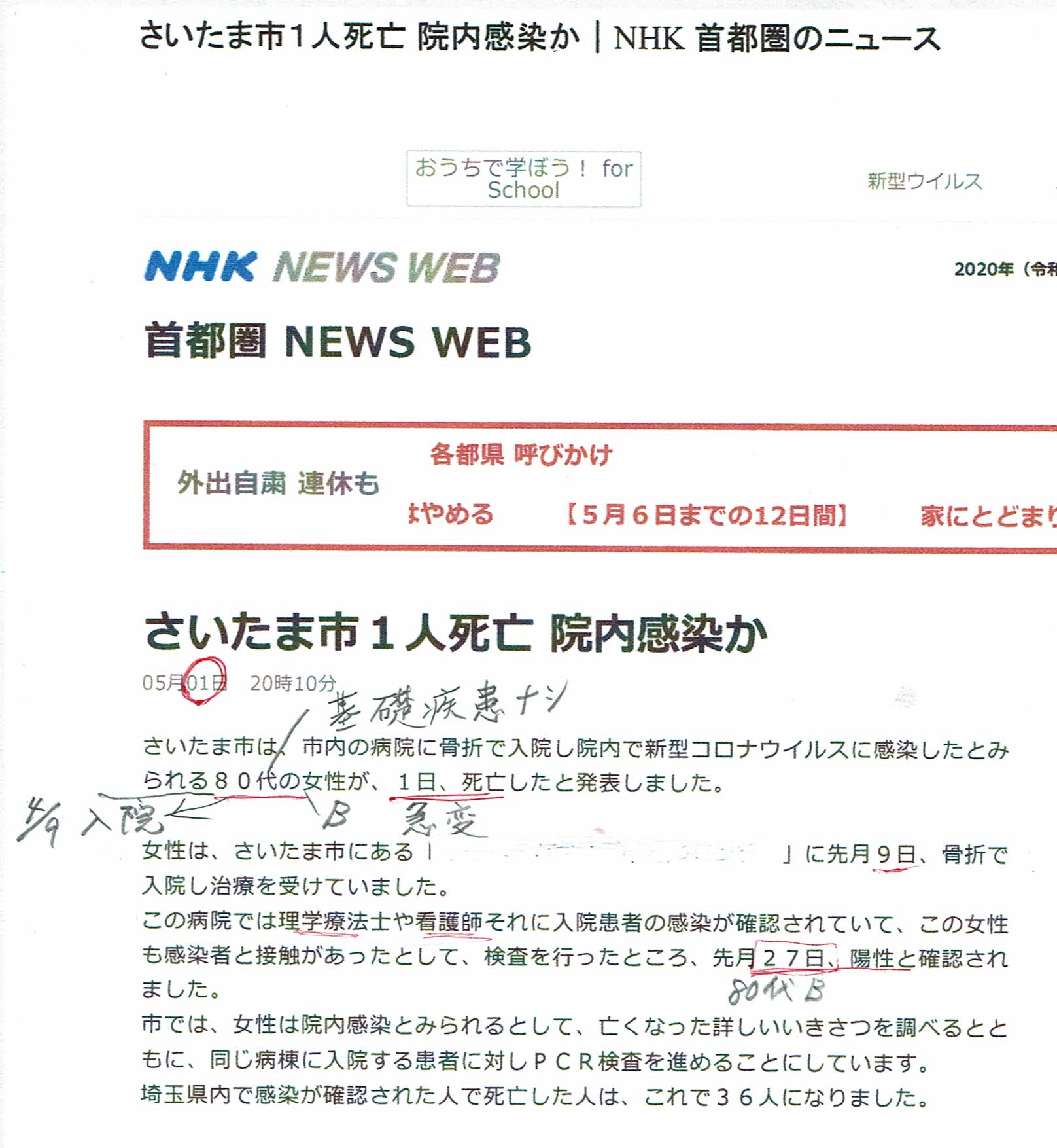 80代の女性Bが肺炎で死亡した(基礎疾患無し、4/9に骨折で入院)。よって息子の私は 動揺した。 |